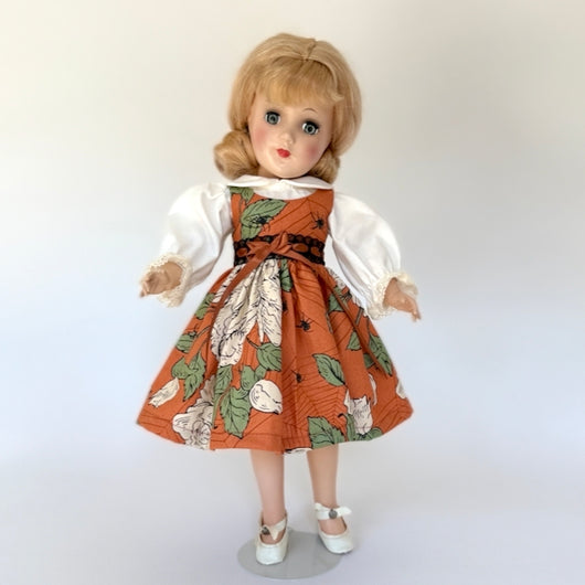 This lovely Fall print with spiders on the jumper coordinates with the larger Gigi size ensemble. Trimmed with a vintage lace and ribbon makes for a festive outfit. The beautiful blouse can coordinate with other Gigi outfits.